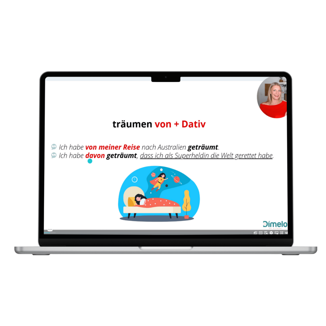 Du brauchst ein B1-Niveau, weil du schon ein gutes Grundwissen brauchst, um alles gut zu verstehen. (Wir wiederholen aber auch viele B1 Themen) Denk daran: Der Kurs ist komplett auf Deutsch.